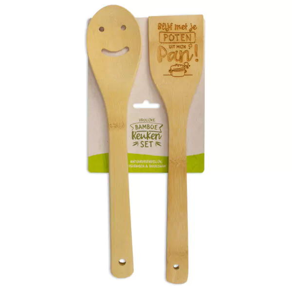 Keukenset van duurzaam bamboe bestaande uit een lepel en spatel met de tekst “Blijf met je poten uit mijn pan!”