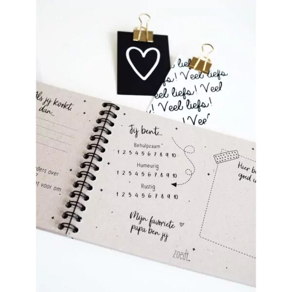 Zoek je een origineel cadeau voor de stoerste vader? Vul dan dit lieve boekje in voor de liefste papa! Het leukste vaderdagcadeau, maar ook leuk om zomaar te geven! Het boekje heeft 28 pagina’s en staat vol met vragen en weetjes over jou en je vader. Daarnaast is er ruimte om foto’s van jullie in te plakken! Als het is ingevuld is ontstaat er een mooi boekje vol liefde en herinneringen. Er staan ook een aantal lieve quotes in.
