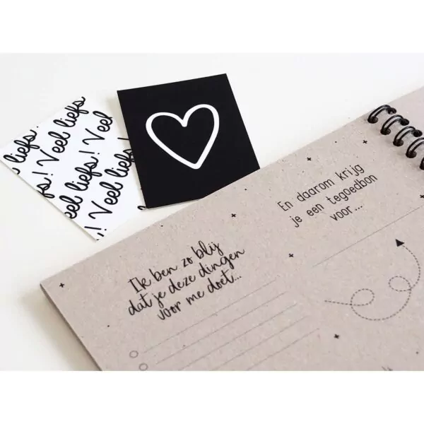 Het boekje is van dik grijsboardkarton en heeft 28 pagina’s binnenwerk.