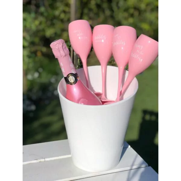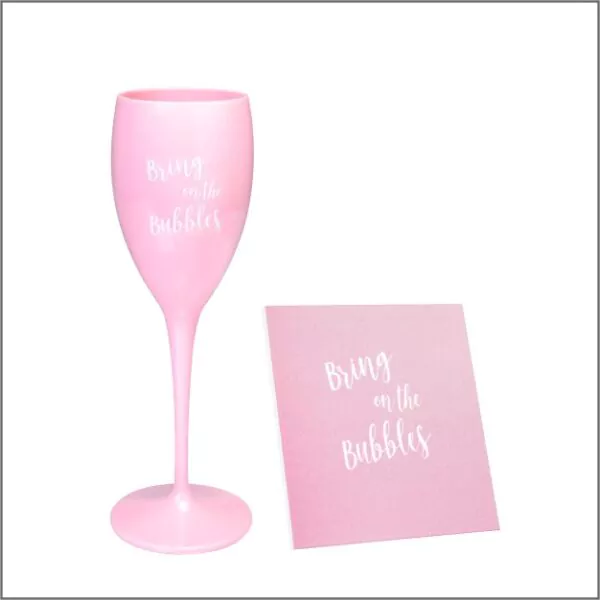Kunststof champagneglas met de tekst “Bring on the bubbles”