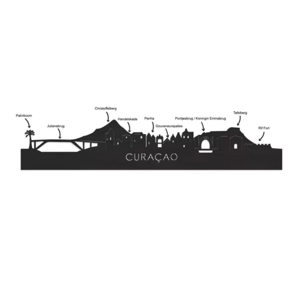 Je herkent ze vast allemaal; de hoogtepunten van deze geliefde plaats: Palmboom, Julianabrug, Christoffelberg, Handelskade, Penha, Pontjesbrug / Koningin Emmabrug, Gouveneurspaleis, Rif Fort en Tafelberg. De skyline is gemaakt in samenwerking met Curaçao ondernemers en het silhouet komt uit het creatieve brein van een architect, dus alle verhoudingen kloppen.
