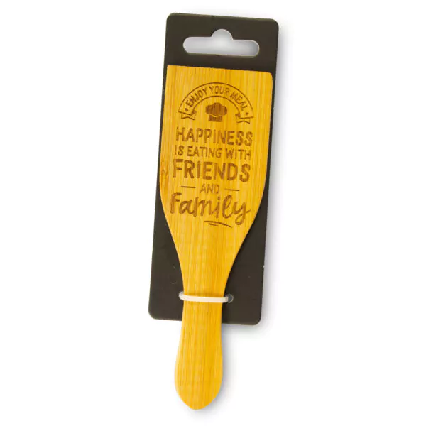 Gourmetspatel met de tekst “Hapiness is eating with friends and family”