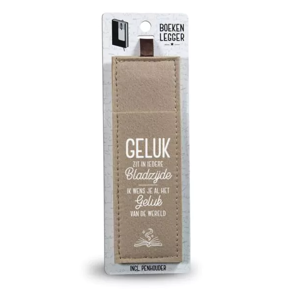 De geluk boekenlegger heeft de tekst: “Geluk zit in iedere bladzijde. Ik wens je al het geluk van de wereld.” en is voorzien van een pennenhouder.