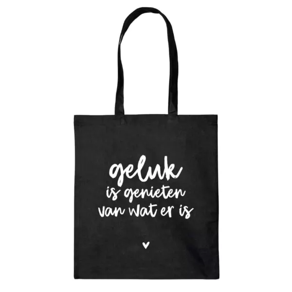 Zwarte katoenen tas met de tekst “Geluk is genieten van wat er is”.