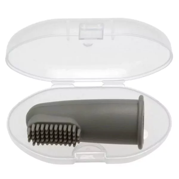 Grijze vingertandenborstel met koker, gemaakt van kinderveilige silliconen.