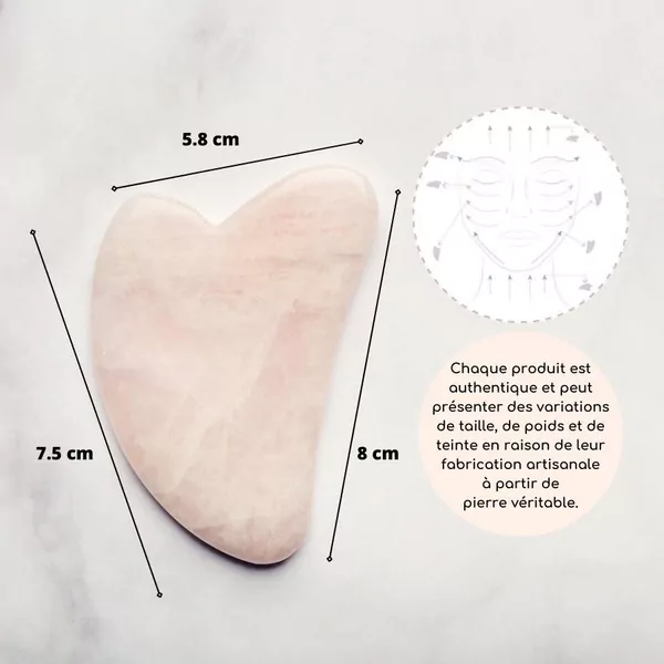 De Gua Sha is gemaakt van natuursteen dat eenvoudig wordt geslepen en gepolijst zonder chemische behandeling. Het is een volledig natuurlijk accessoire dat geen chemische of schadelijke stoffen bevat. De vorm is gemaakt om perfect te passen bij de lijnen van het gezicht met een goede grip.