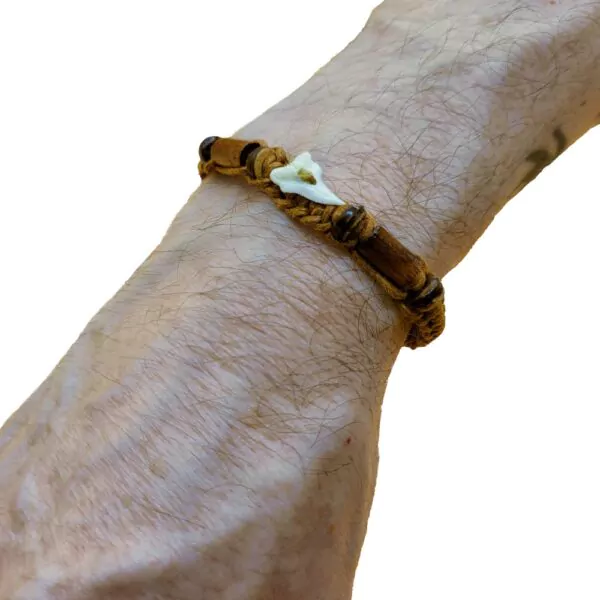 Deze haaientand-armband is handgevlochten en versiert met kralen en een echte haaientand. Door het schuifsysteem past deze op bijna elke heren- of jongenspols. Op de kleinste stand is de omtrek van de armband ongeveer 18 centimeter en op de grootste stand ongeveer 34 centimeter. Omdat de armband met de hand is gemaakt en deels van natuurlijke materialen zijn deze niet identiek aan elkaar.