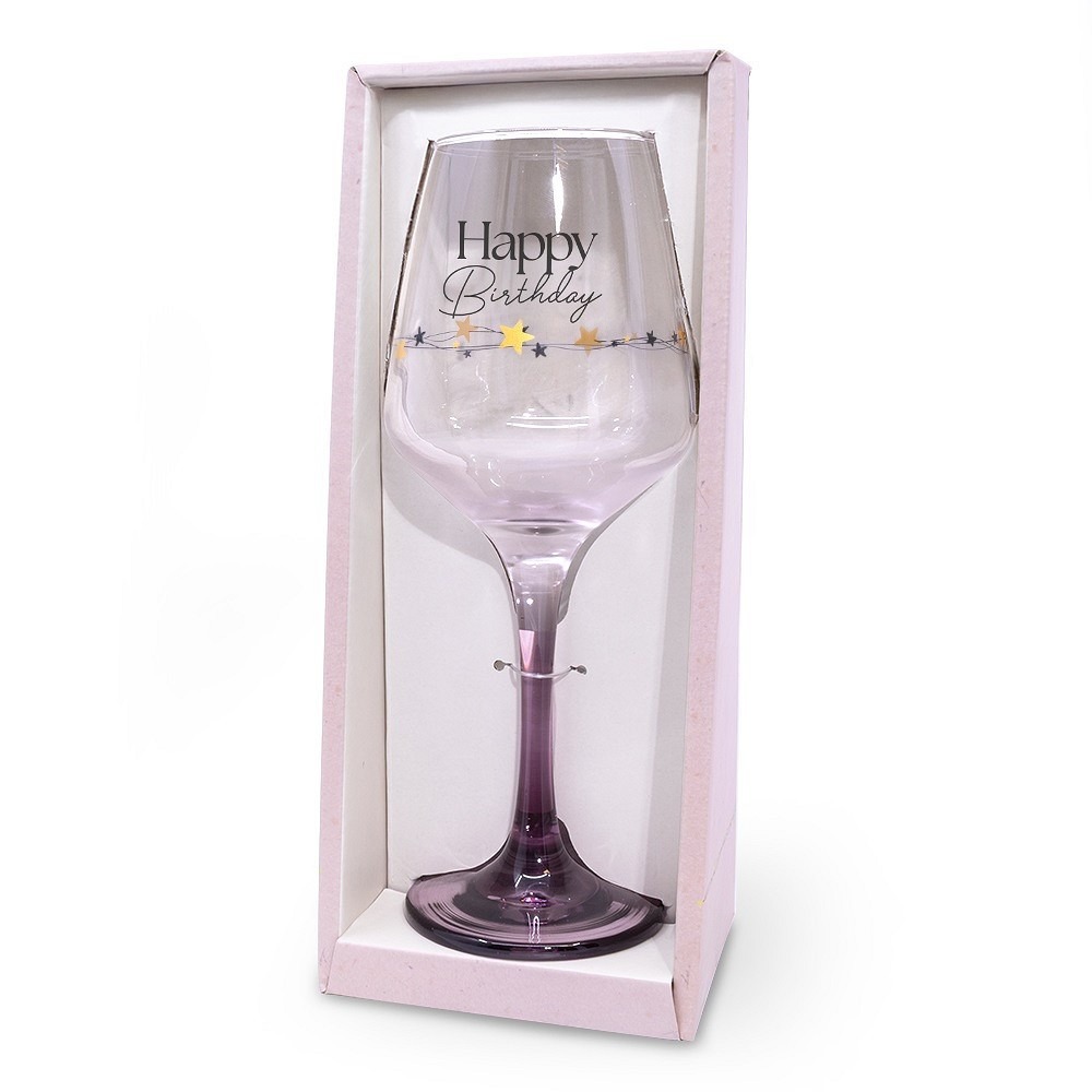 Vier elke verjaardag met het luxe Happy Birthday wijnglas van 350 ml. Dit hoogwaardige glas met auberginekleurige voet en gouden sterren is het ultieme cadeau voor elke jarige wijnliefhebber.