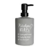 Het kitchen rules zeeppompje heeft de tekst: “Kitchen rules: wash your hands, enjoy the food, kiss the chef”