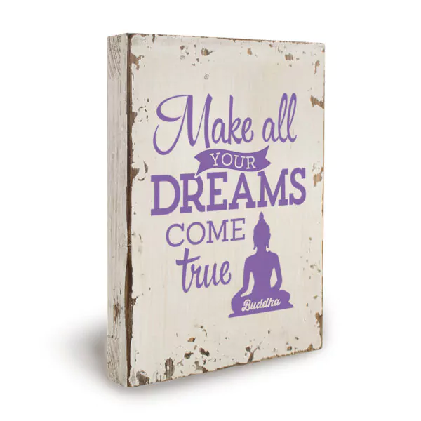 Houten decoratie met de tekst “Make all your dreams come true” en een afbeelding van Boeddha.