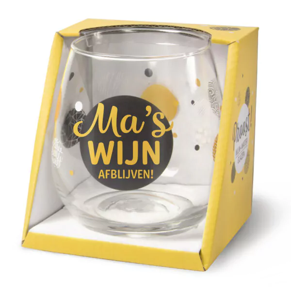 Het Ma’s wijn wijnglas of waterglas is een wijnglas of waterglas met de tekst “Ma’s wijn. Afblijven!”.