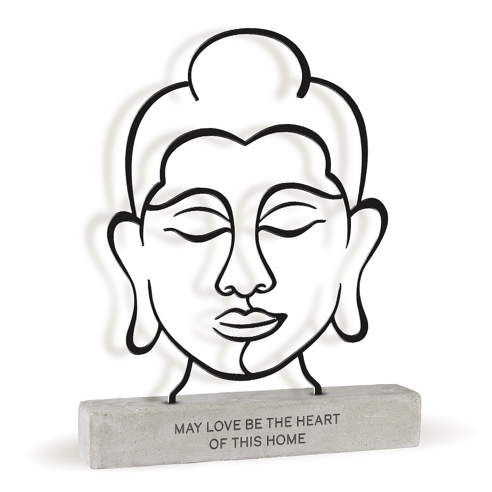 De “May Love metal art deco” is een verfijnd kunstobject dat sereniteit en verbondenheid uitstraalt. Het minimalistische draadontwerp vormt een gestileerd gezicht met gesloten ogen, geïnspireerd op rust en reflectie, geplaatst op een stevige betonnen sokkel. De ingekerfde boodschap “MAY LOVE BE THE HEART OF THIS HOME” geeft het geheel een warme, huiselijke betekenis. Door de combinatie van spirituele eenvoud en emotionele diepgang is dit beeldje een subtiele blikvanger die elke ruimte een gevoel van harmonie en liefde meegeeft.