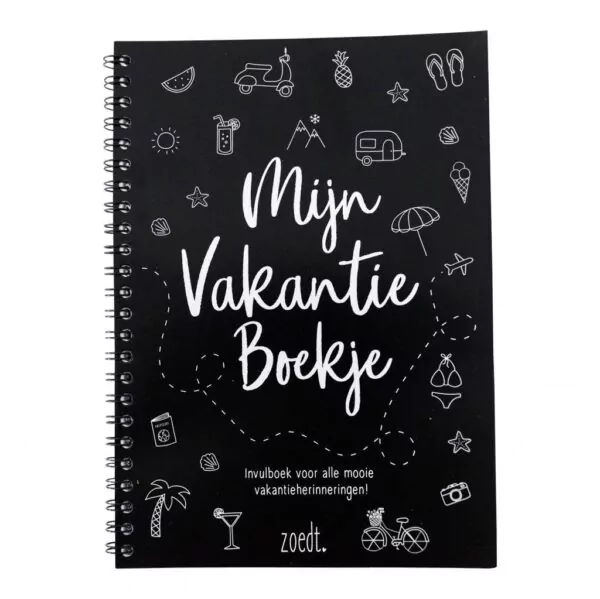 Mijn Vakantieboekje is een zwart wit A5 vakantiedagboek met 88 pagina’s, ontworpen door Zoedt. Het biedt ruimte om al je vakantieverhalen, herinneringen en weetjes vast te leggen. Per vakantie kun je 12 pagina’s invullen, met vragen over je reis, muziek, boeken, bezochte plekken en favoriete adresjes.