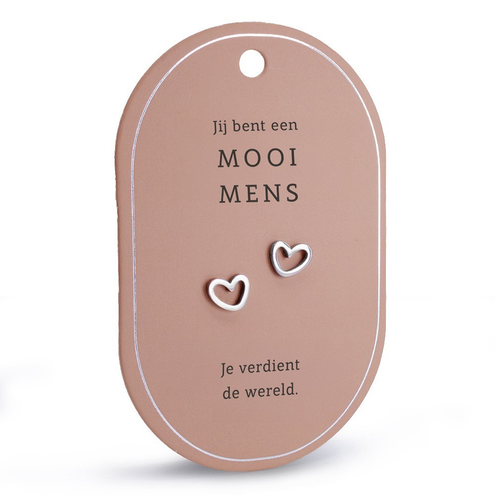 De Mooi mens hartoorbellen (zilver) zijn subtiele, zilverkleurige oorbellen van duurzaam roestvrij staal, gepresenteerd op een kaartje met warme kleuren en een persoonlijke boodschap. Ideaal als betekenisvol cadeau.