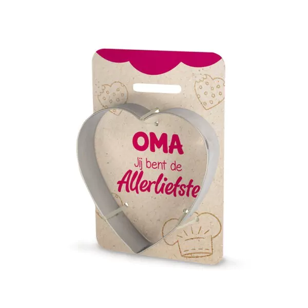 Het oma koekvormpje heeft de vorm van een hart met de tekst “Oma, jij bent de allerliefste”