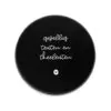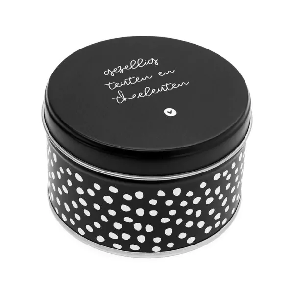 Rond theeblik zwart met witte tekst: “Gezellig teuten en theeleuten”.