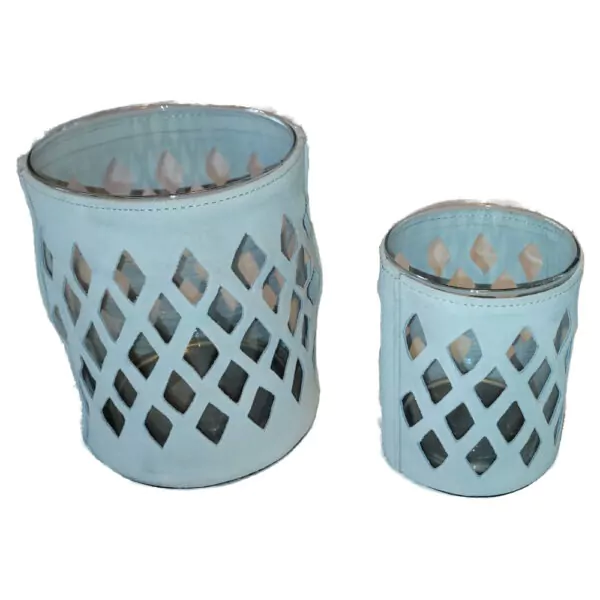 Theelichtglas met een witte suède hoes met hierin een ruitvorm.