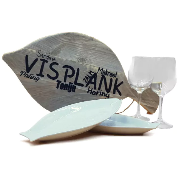 - Een houten serveerplank met de tekst “VISPLANK” in het midden. Deze plank is perfect om uw vis op te snijden, te kruiden en te serveren. De plank heeft een afmeting van 55 x 27 x 3 cm en is gemaakt van duurzaam hout.