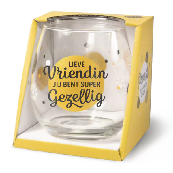 Het Vriendin wijnglas of waterglas is een wijnglas of waterglas met de tekst “Lieve vriendin, jij bent supergezellig”.