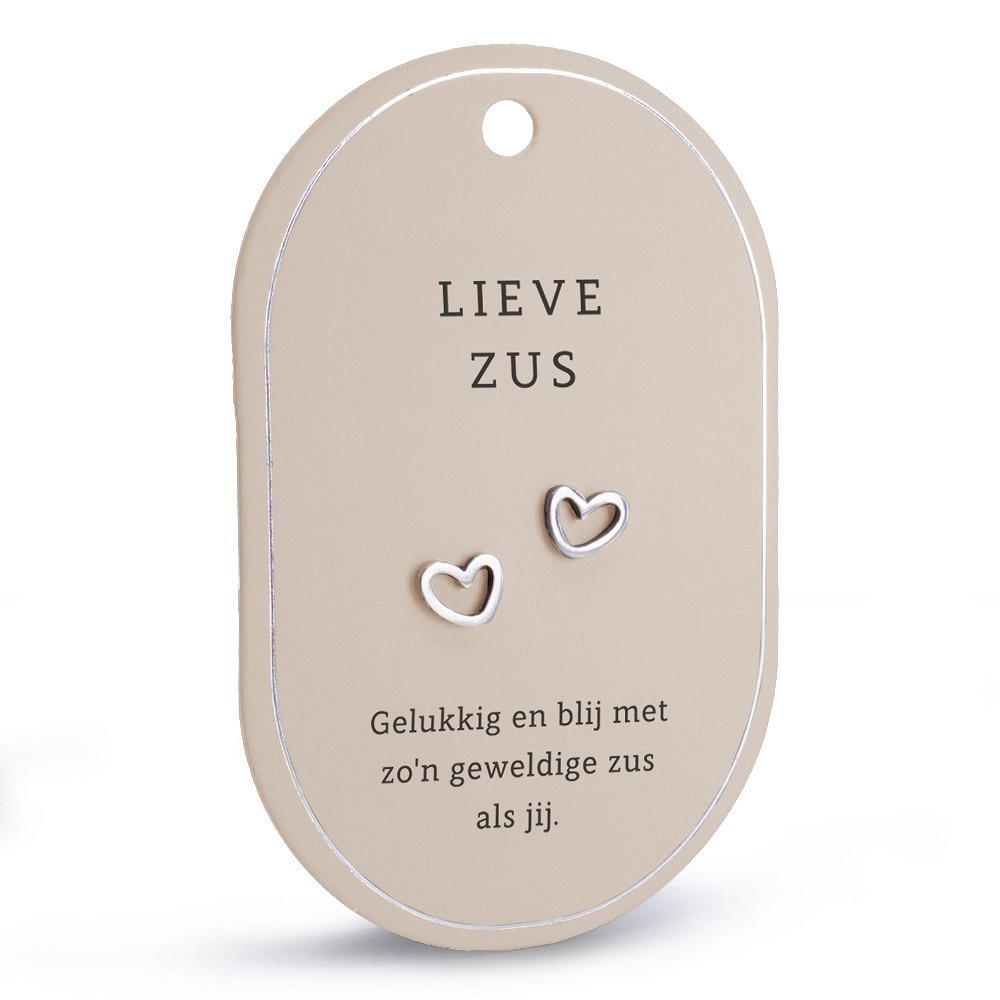 De Zus hartoorbellen (zilver) zijn subtiele, zilverkleurige oorbellen van duurzaam roestvrij staal, gepresenteerd op een kaartje met warme kleuren en een persoonlijke boodschap. Ideaal als betekenisvol cadeau.