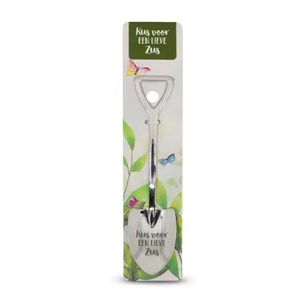 De zus tuinlepel is een theelepel in de vorm van een schop met de tekst “Kus voor een lieve zus” en is een ideaal kado voor iemand met groene vingers.