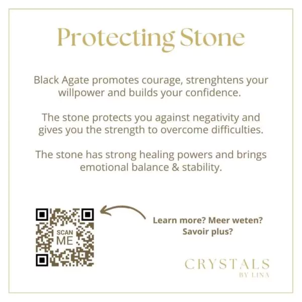 Zwarte agaat bevordert moed, versterkt je wilskracht en bouwt je vertrouwen op. De steen beschermt je tegen negativiteit en geeft je de kracht om problemen te overwinnen. De steen heeft sterke helende krachten en brengt emotionele balans en stabiliteit.
